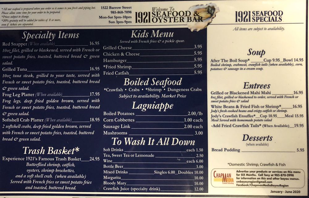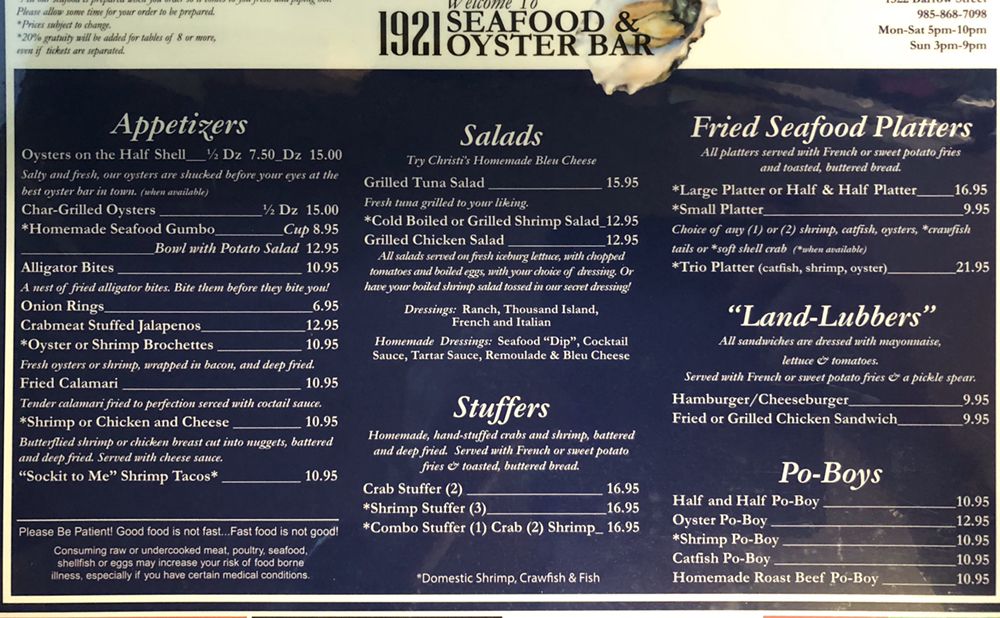 Welcome to 1921 Seafood And Oyster Bar, a hidden gem located in the heart of Houma, Louisiana. This seafood haven offers a mouthwatering menu that showcases the rich flavors of the bayou. Guests can indulge in a variety of PoBoys like the delicious Half And Half and the classic Oyster PoBoy, each bursting with freshness. The menu also features delightful Lagniappe such as boiled potatoes and corn cobbettes, making every meal a true Southern experience.